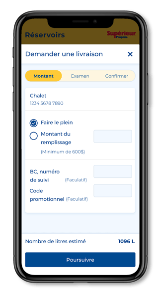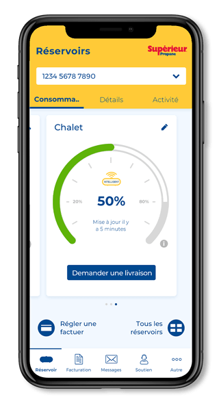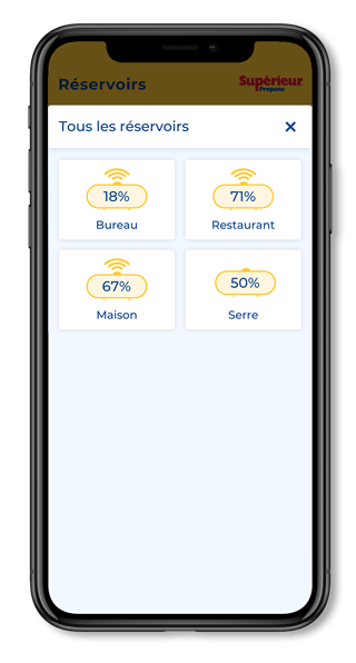 (En cliquant sur le bouton, on voit une demande d’appoint de réservoir de propane sur l’application monSUPÉRIEUR sur un téléphone cellulaire .)Visualiser les niveaux des réservoirs