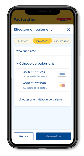 (En cliquant sur le bouton, on voit la revue de diverses cartes de paiement reliées au compte d’un client de Supérieur Propane sur un téléphone cellulaire.)Gérer plusieurs sites et utilisateurs