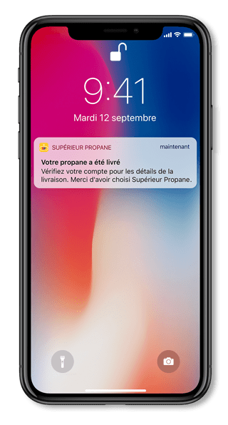 (En cliquant sur le bouton, on voit un avis de livraison de propane à l’écran d’un téléphone cellulaire.)Demande de livraisons